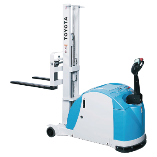 狭い通路や天井の低い現場でもスムーズに扱える、コンパクト設計の歩行操作式・電動フォークリフトです。